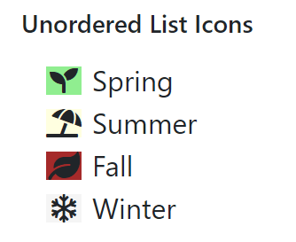 <ul class="fa-ul" style="font-size: 2rem"> <li><span class="fa-li"><i class="fas fa-fw fa-seedling" style="background: lightgreen"></i></span>Spring</li> <li><span class="fa-li"><i class="fas fa-fw fa-umbrella-beach" style="background: lightyellow"></i></span>Summer</li> <li><span class="fa-li"><i class="fas fa-fw fa-leaf" style="background: brown"></i></span>Fall</li> <li><span class="fa-li"><i class="far fa-fw fa-snowflake" style="background: whitesmoke"></i></span>Winter</li> </ul>